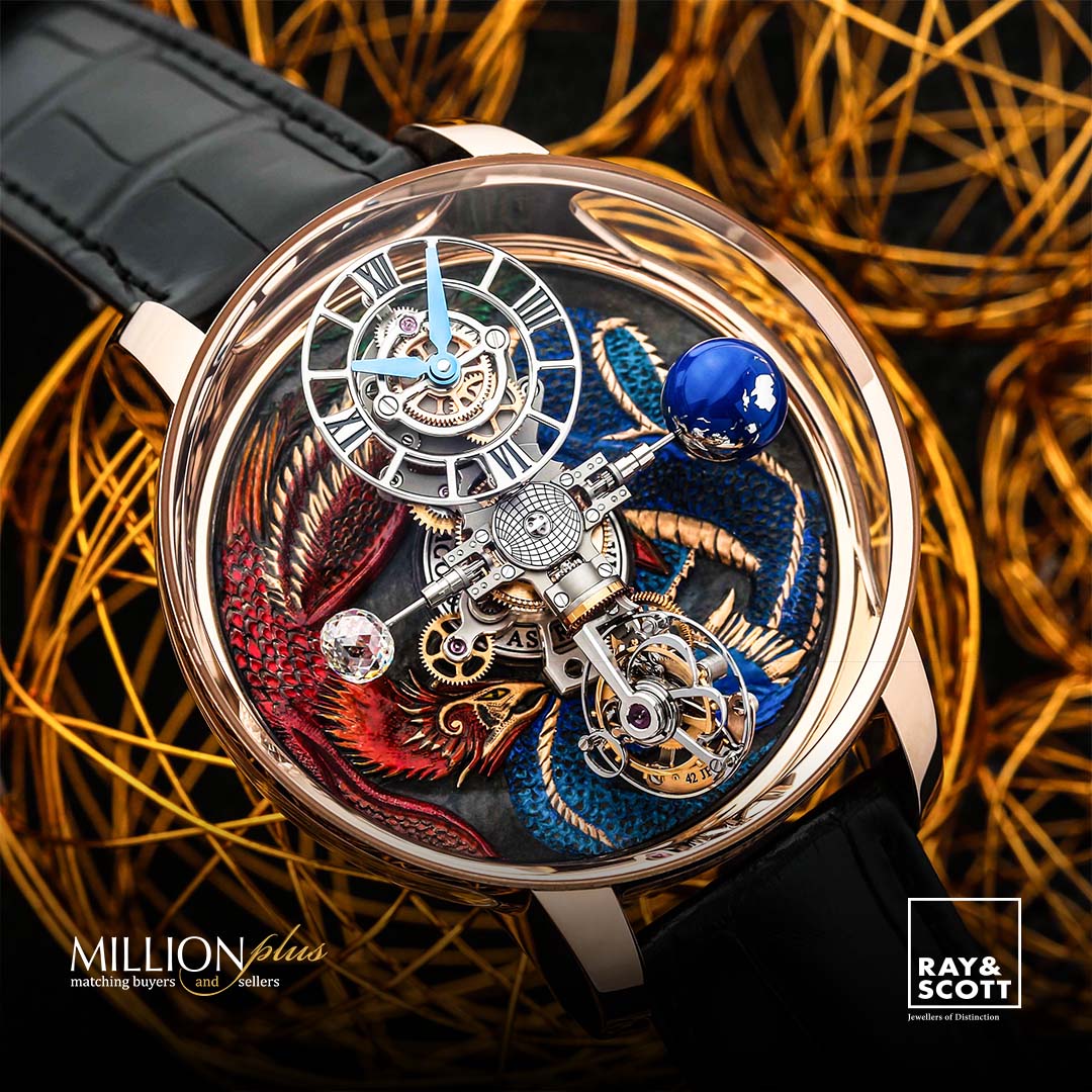 The Astronomia Art Dragon and Phoenix, representing the perfect balance of yin and yang, showcases the incredible 3-D bas relief hand-engraved work in 18K rose gold within the Astronomia Tourbillon sapphire crystal and 18K gold case.