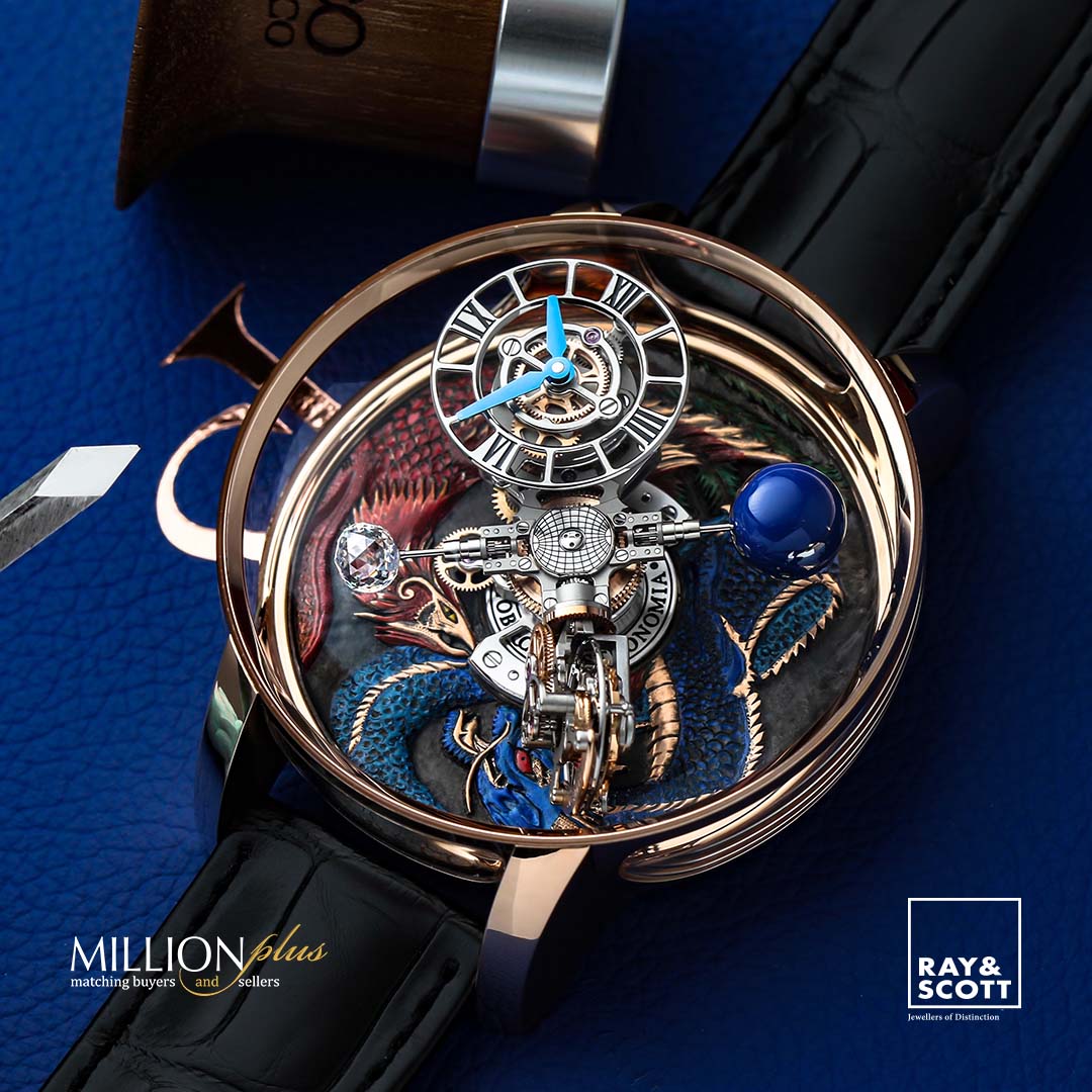 Working with 18K rose gold is a challenge, and Jacob & Co.’s master engraver exceeded all expectations. The incredible engraving of the dragon and phoenix took months of pain-staking work, because any misstep or mistake meant starting over from scratch.