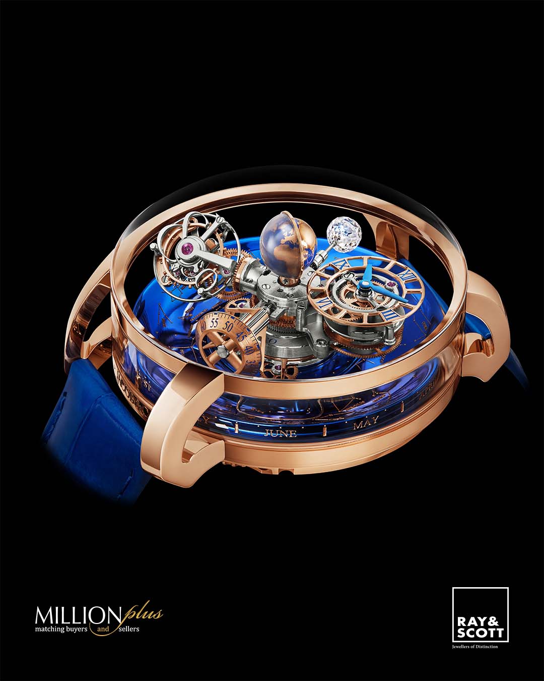 The Astronomia Sky’s case measures 47 millimeters in diameter and 25 millimeters thick between the highest point of its specially curved front sapphire crystal and the lowest point of its case. Its 18K Rose Gold case holds a single-piece sapphire crystal window around its periphery, allowing for unhindered viewing of the spectacular caliber inside. One’s focus on the universe that lives inside the Astronomia Sky is further assisted by the openworked lugs – a minute, yet important detail that drives ones vision towards the center of the timepiece.