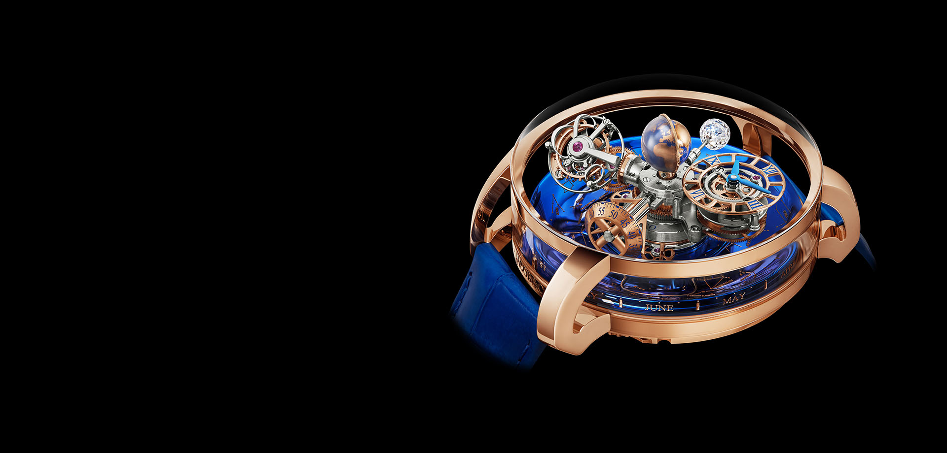 The Astronomia Sky’s case measures 47 millimeters in diameter and 25 millimeters thick between the highest point of its specially curved front sapphire crystal and the lowest point of its case. Its 18K Rose Gold case holds a single-piece sapphire crystal window around its periphery, allowing for unhindered viewing of the spectacular caliber inside. One’s focus on the universe that lives inside the Astronomia Sky is further assisted by the openworked lugs – a minute, yet important detail that drives ones vision towards the center of the timepiece.